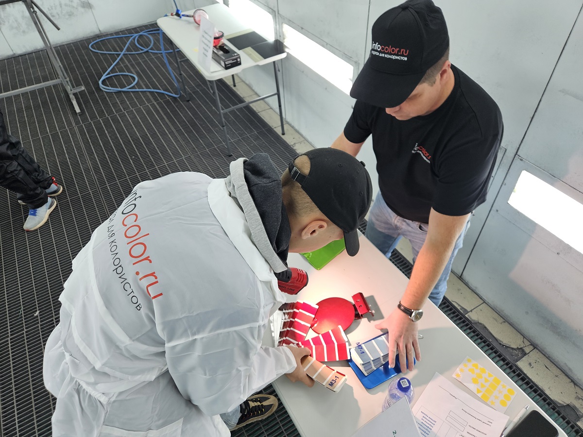 В этом году специалистами Учебного Центра Интерколор был подготовлен целый ряд увлекательных заданий, где всем участникам конкурса предлагалось окунуться в нюансы кузовного ремонта. Нанести равномерный шов герметика, смешать компоненты ЛКМ в нужной пропорции, быстро и качественно замаскировать деталь перед грунтованием, ну и, конечно, корректно определить цвет и размер “металлика” в составе краски – вот совсем небольшой список того, что предстояло выполнить конкурсантам и заодно почувствовать себя настоящими сотрудниками автосервиса.