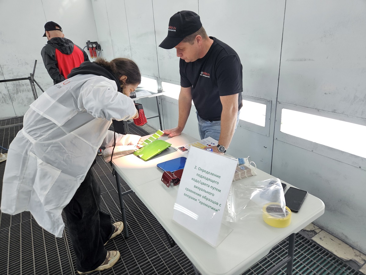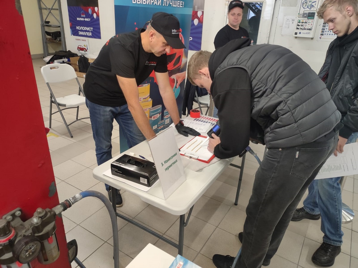 В этом году специалистами Учебного Центра Интерколор был подготовлен целый ряд увлекательных заданий, где всем участникам конкурса предлагалось окунуться в нюансы кузовного ремонта. Нанести равномерный шов герметика, смешать компоненты ЛКМ в нужной пропорции, быстро и качественно замаскировать деталь перед грунтованием, ну и, конечно, корректно определить цвет и размер “металлика” в составе краски – вот совсем небольшой список того, что предстояло выполнить конкурсантам и заодно почувствовать себя настоящими сотрудниками автосервиса.