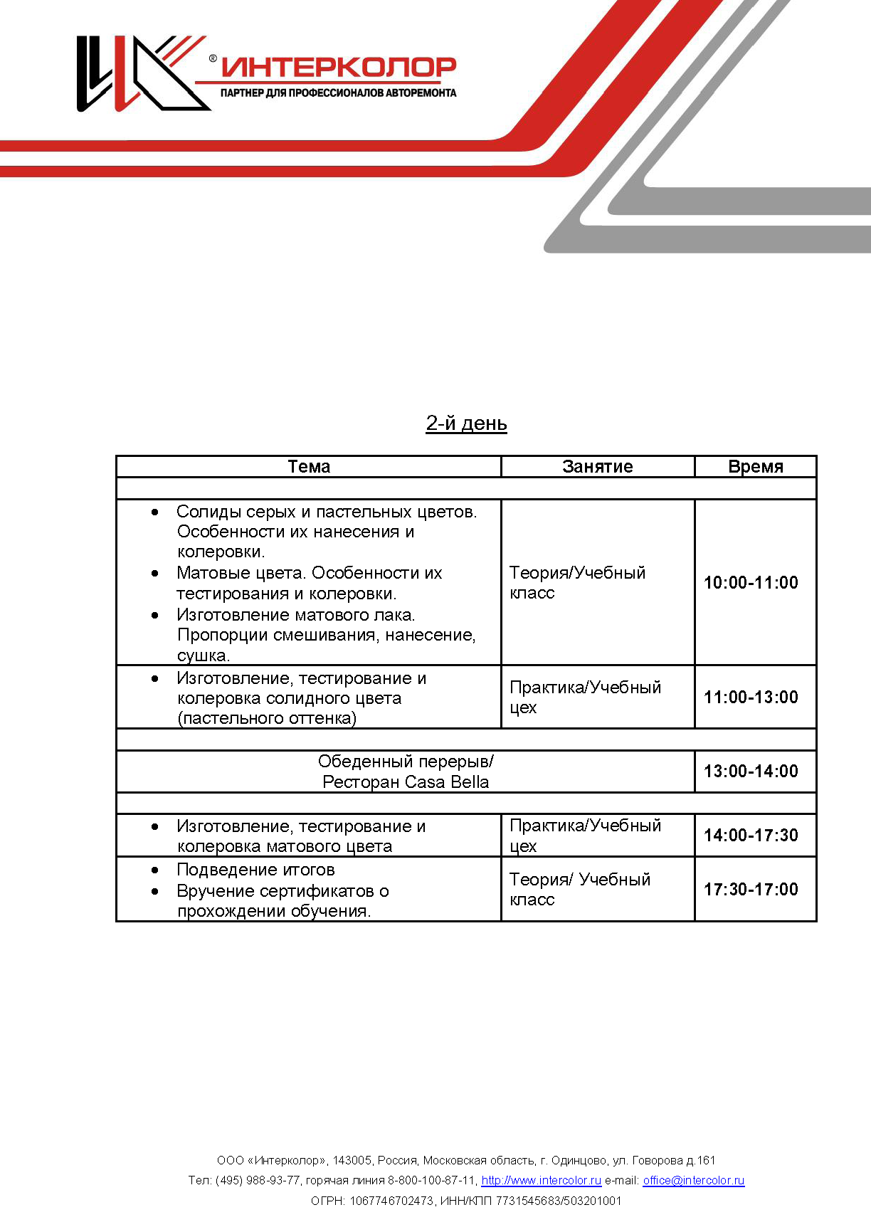 Учебный Центр "Интерколор": подготовка колористов (сервис-формулы), курсы для маляров (технология окраски), семинары по цветоподбору (колористика), технология локального ремонта, технология полировки, семинары для руководителей СТОА и мастеров цехов, выездные семинары.