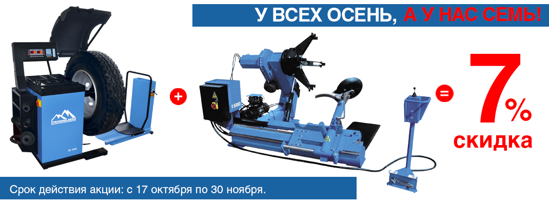 В этот осенний сезон Trommelberg предоставляет возможность каждому покупателю приобрести комплект оборудования для грузового шиномонтажа (балансировочный станок СВ1448 + шиномонтажный станок 1580) с дополнительной скидкой 7%.